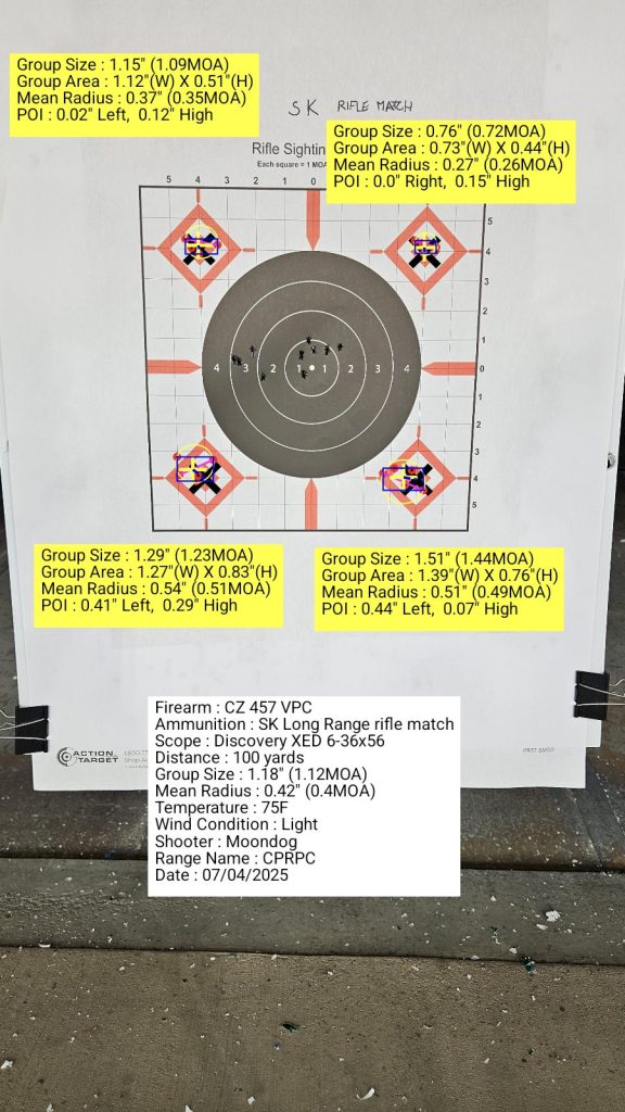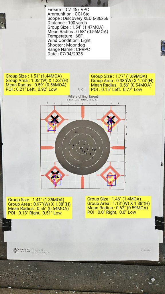I am testing various 22LR rimfire ammunition at 100 yards to determine which produces the tightest groups in my CZ 457 rifle. My rifle build is a factory-stock CZ 457 VPC, topped with an Area 419 Picatinny rail, and a Discovery Optics XED 6-36×56 scope (their top-tier long-range optic with Japanese eXtra Low Dispersion ED glass).