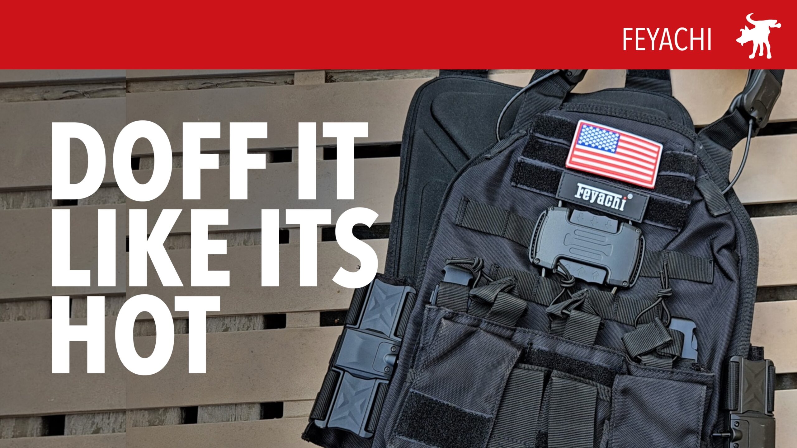 Feyachi came up with what may be the easiest way to take off a PC: magnetic buckles. They came up with a unique system that connects the shoulder straps and cummerbund to the front plate that easily disconnects using a cable actuated magnetic buckles. These buckles snap into locking position mechanically. Pulling the cables, moves the magnets which unlock the buckles. This disconnect process is nearly instantaneous and while not always 100%, disconnects enough of the 4 buckles to easily pull off the PC vest of the user.