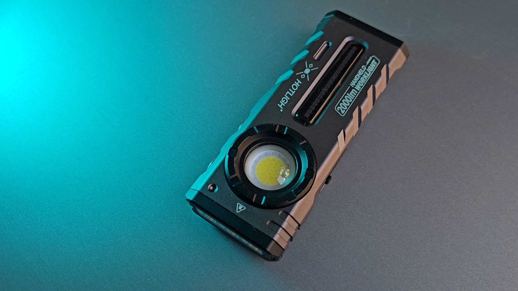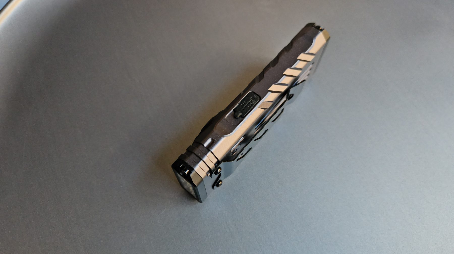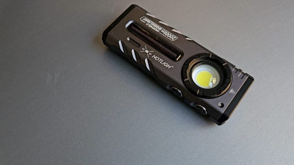 Name aside, their flashlight came in a black box without accessories, save for a USB-C charging cable. The body is made of sturdy aluminum with a sci-fi style that wouldn’t look out of place in a video game or movie. The flashlight has a flattened blade-style design with a primary spot at the one end, a magnetic tail on the opposite end, and a large flood light on its flat side. It’s a bit too big and heavy to be an appealing EDC light but the flat shape and belt clip, facilitate stowing it in a pocket.