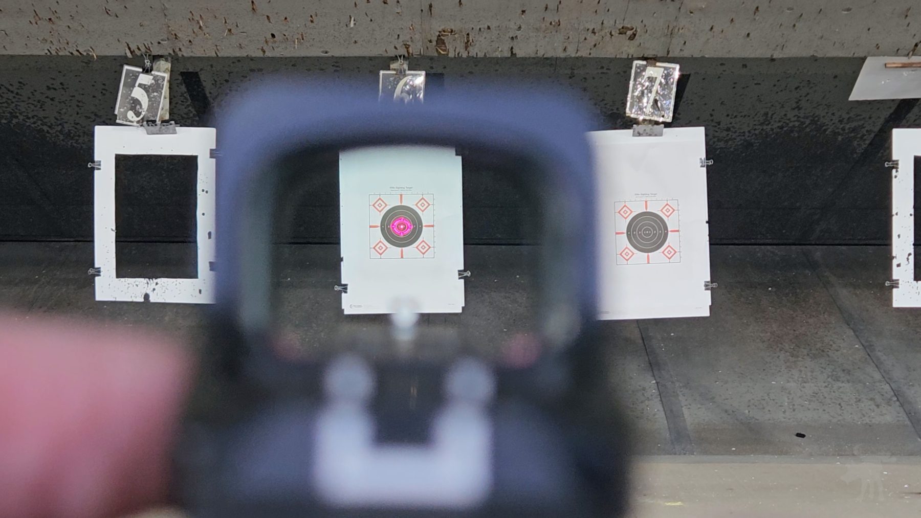 This RMR footprint optic has a clear window at the rear to protect the rear of the lens from weather, moisture, and debris that could render traditional reflex sights useless. The unit has a relatively low deck, though not low enough for me to co-witness my Glock’s factory sights. The unit has a set of spring-loaded pop-up rear sights built into the rear deck, which can be utilized with some practice.