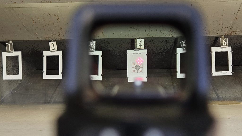 I ran through a box of ammo and found the 3MOA not too small to find and aim. I’m relatively new to using red dots on a pistol so it helped me to find the dot by increasing the dot brightness to the point of blooming for faster target acquisition. For more precision, I tone the brightness to get a finer point. Running through alternating target drills I was generally able to get most of my shots within an 8″ target in rapid fire. I don’t think this is gold medal performance but for me the Midas Flash aims like a winner.