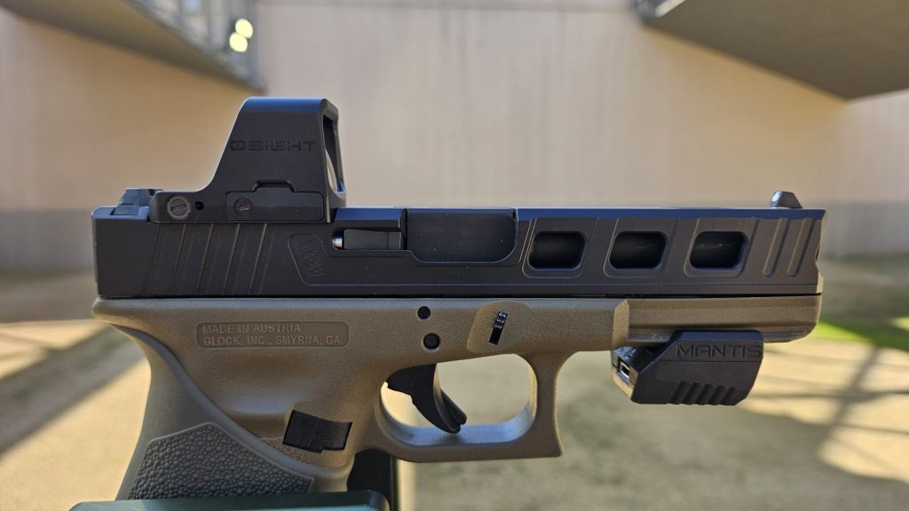 This RMR footprint optic has a clear window at the rear to protect the rear of the lens from weather, moisture, and debris that could render traditional reflex sights useless. The unit has a relatively low deck, though not low enough for me to co-witness my Glock’s factory sights. The unit has a set of spring-loaded pop-up rear sights built into the rear deck, which can be utilized with some practice.