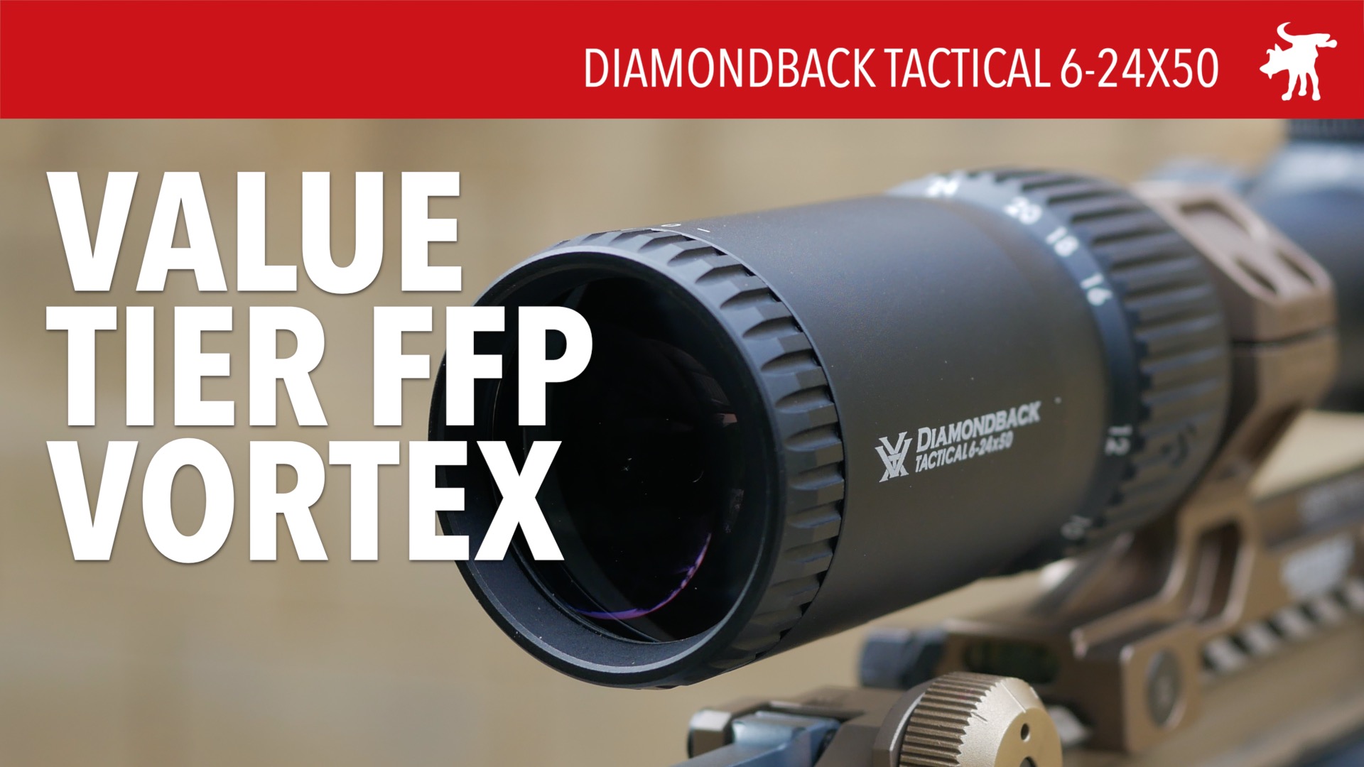 Vortex describes the Diamondback Tactical 6-24x50mm riflescope as a “long-range wolf in sheep’s clothing” Instead of gee-whiz features such as zero-stop turrets, a removable throw lever, or illumination, it focuses on basics: bright XD glass and a first focal plane reticle.